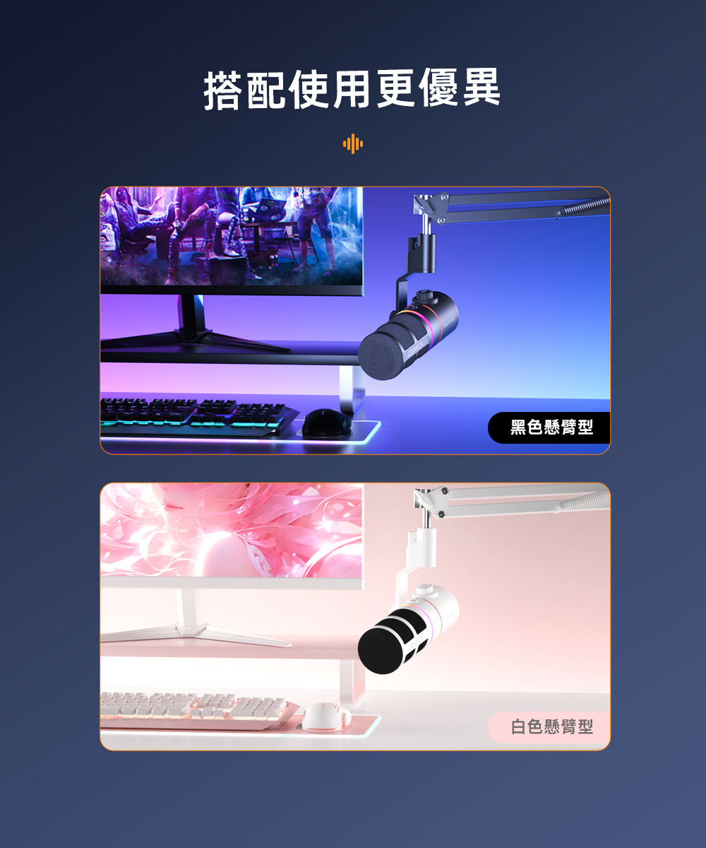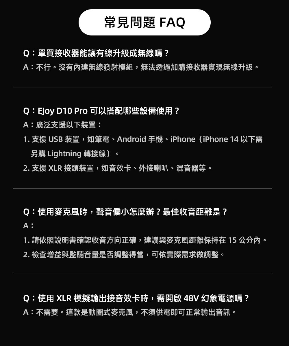 注意事項:懸臂型產品僅包含: 麥克風(TX)*1、接收器(RX)*1、充電線/音訊傳輸線*1、USB-A轉USB-C轉接頭*1、懸臂支架*1、魔術貼*5、使用說明書*1。