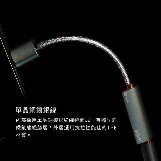 線材採用單晶銅鍍銀線,外層則選用抗拉性能佳的TPE材質。