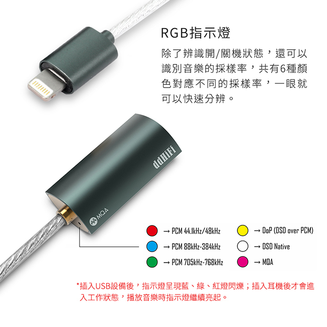 側邊具有RGB指示燈,6種顏色快速辨別不同的採樣率。