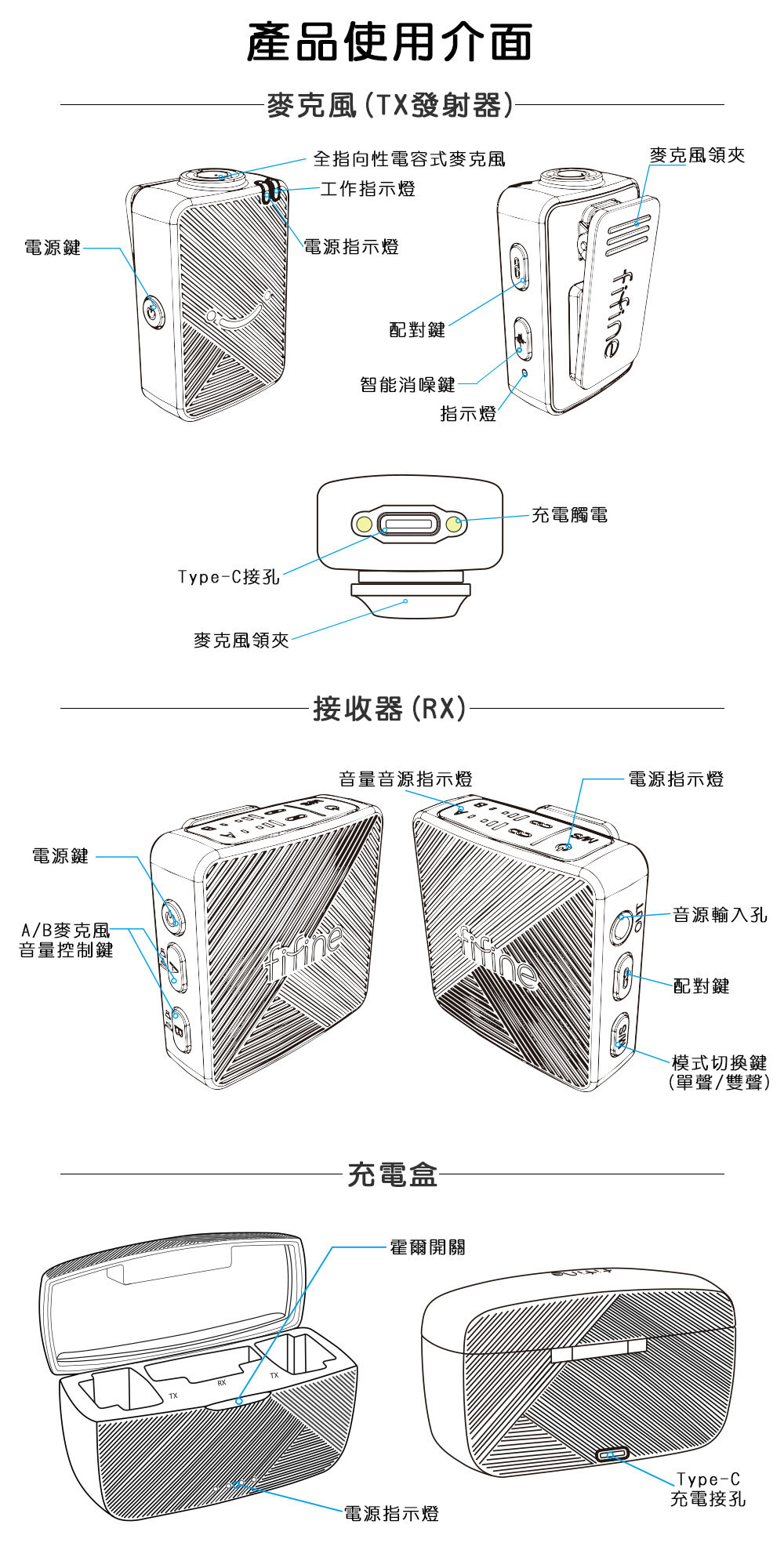 無線電容式麥克風TX發射器*2、RX接收器*1、充電盒*1