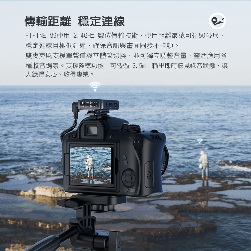 FIFINE M9使用 2.4GHz 數位傳輸技術,使用距離最遠可達50公尺,穩定連線且極低延遲,確保音訊與畫面同步不卡頓。
