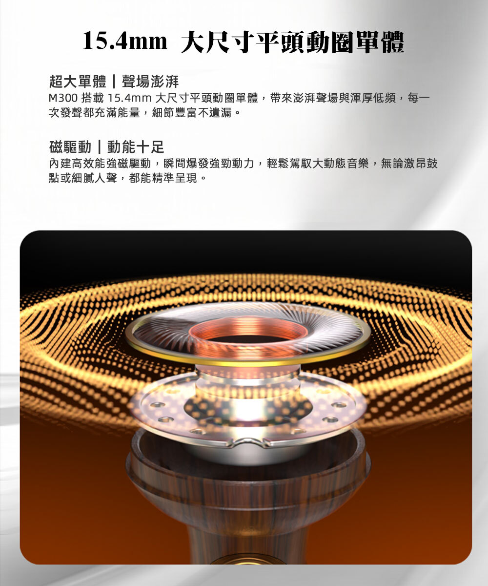 M300 搭載 15.4mm 大尺寸平頭動圈單體,帶來澎湃聲場與渾厚低頻,每一次發聲都充滿能量,細節豐富不遺漏。