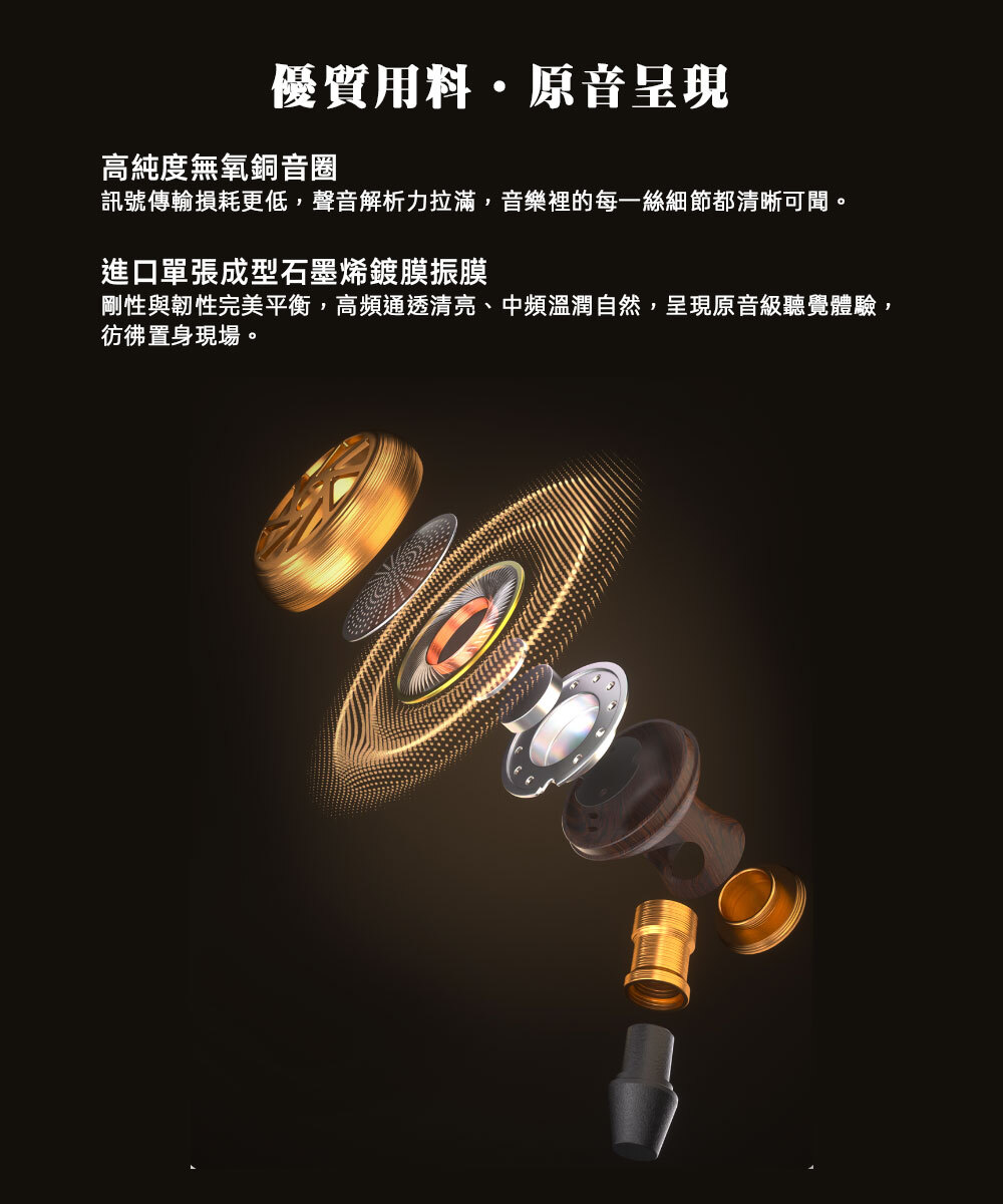 剛性與韌性完美平衡,高頻通透清亮、中頻溫潤自然,呈現原音級聽覺體驗,彷彿置身現場。
