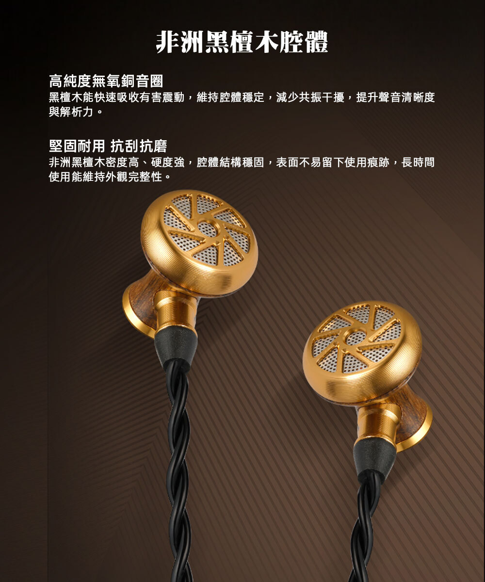 黑檀木能快速吸收有害震動,維持腔體穩定,減少共振干擾,提升聲音清晰度與解析力。
