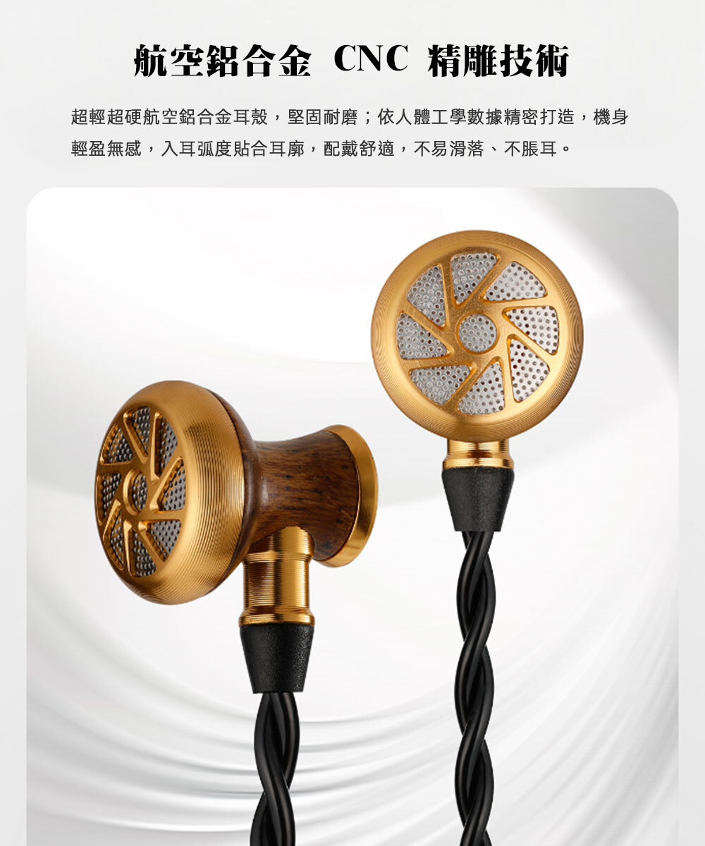 超輕超硬航空鋁合金耳殼,堅固耐磨;依人體工學數據精密打造,機身輕盈無感,入耳弧度貼合耳廓,配戴舒適,不易滑落、不脹耳。