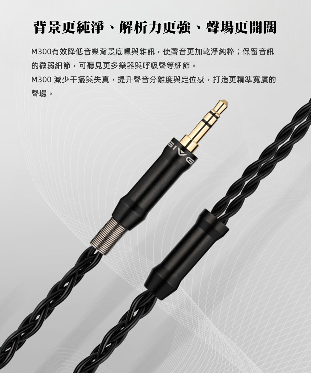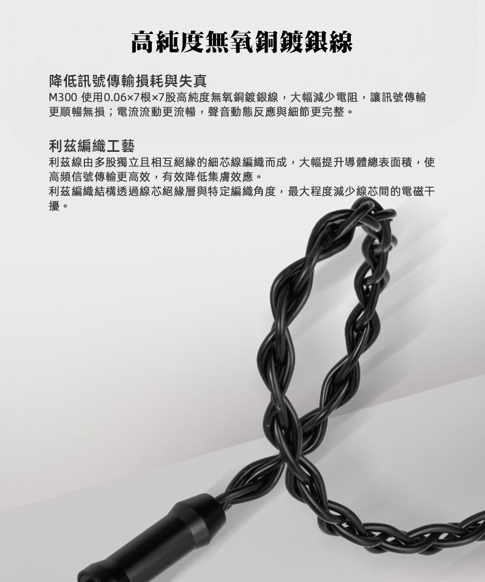 M300 使用0.06×7根×7股高純度無氧銅鍍銀線,大幅減少電阻,讓訊號傳輸更順暢無損;電流流動更流暢,聲音動態反應與細節更完整。