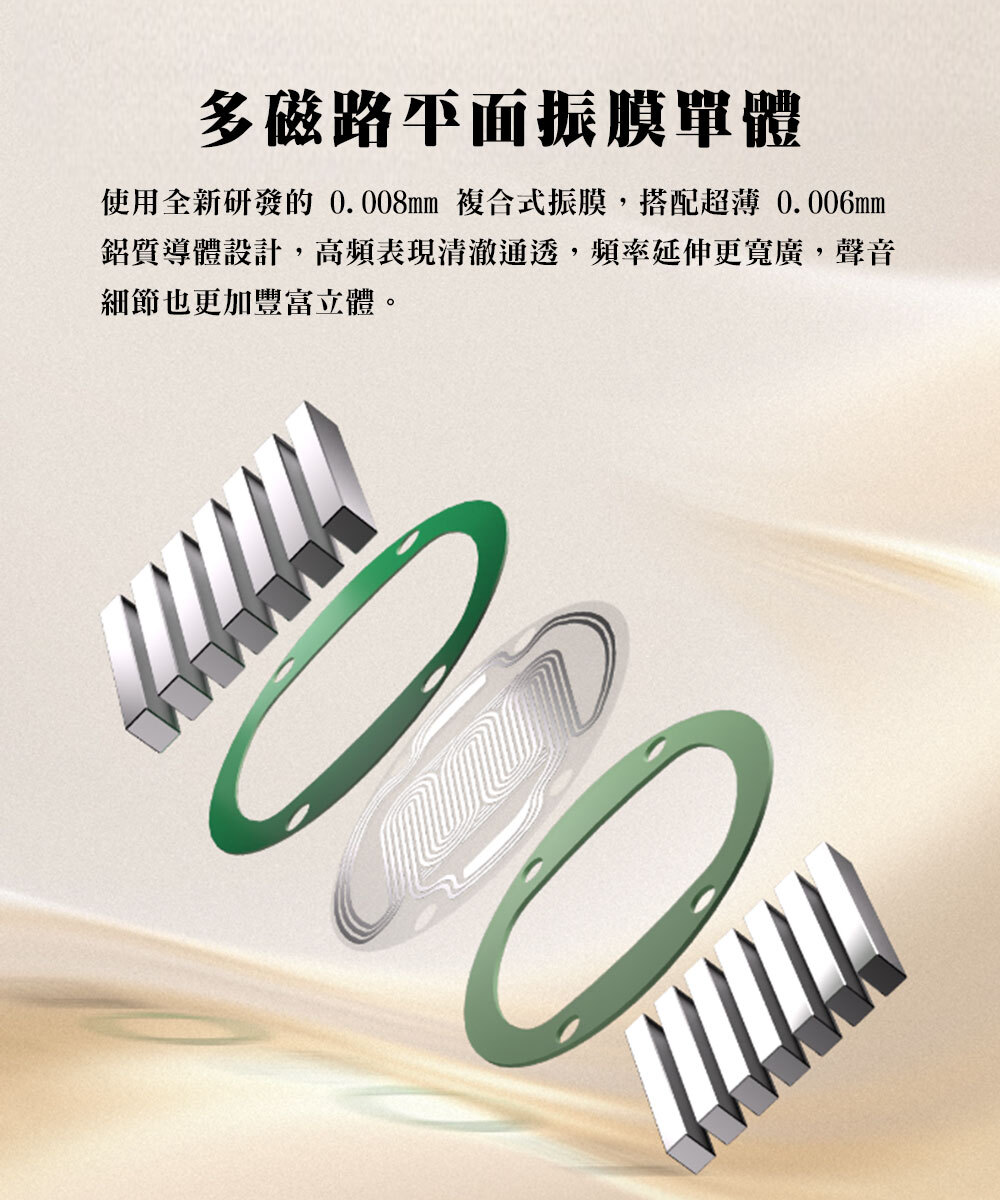 使用品牌自研的多磁路平面振膜設計,兼具高靈敏度與均衡的音場表現,瞬態反應迅速,聲音收放更俐落。