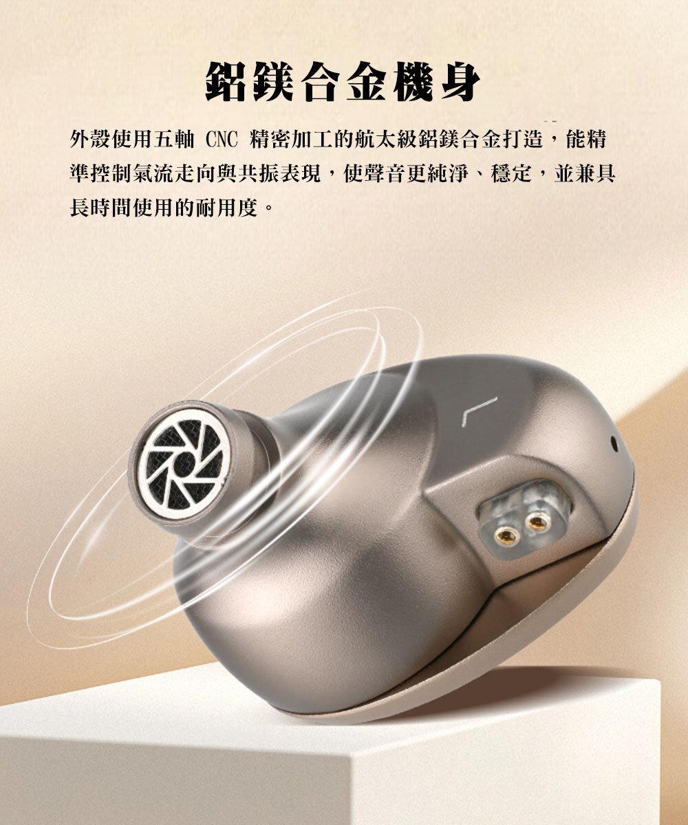 外殼使用五軸 CNC 精密加工的航太級鋁鎂合金打造,能精準控制氣流走向與共振表現,使聲音更純淨、穩定,並兼具長時間使用的耐用度。