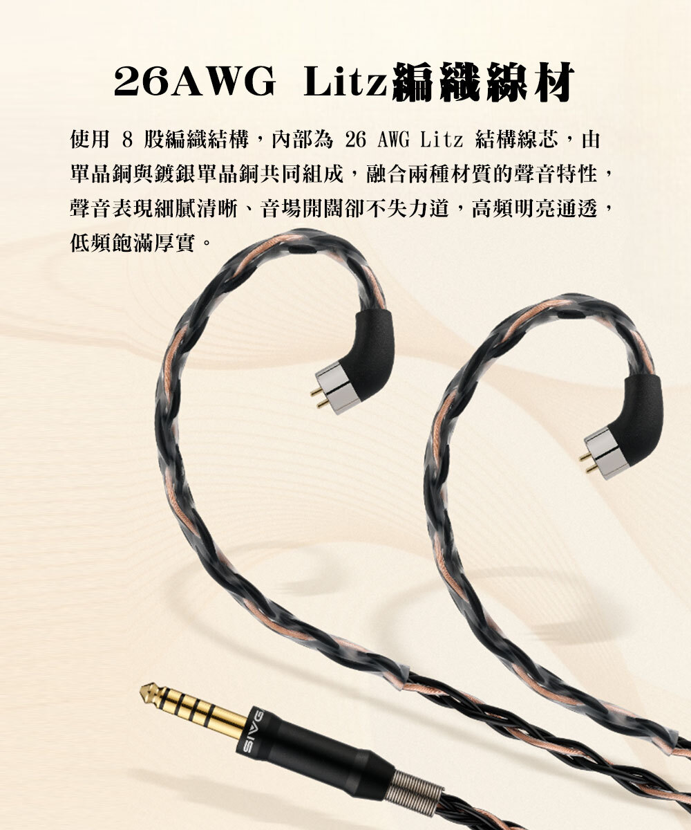 使用 8 股編織結構,內部為 26 AWG Litz 結構線芯,由單晶銅與鍍銀單晶銅共同組成,融合兩種材質的聲音特性,聲音表現細膩清晰、音場開闊卻不失力道,高頻明亮通透,低頻飽滿厚實。