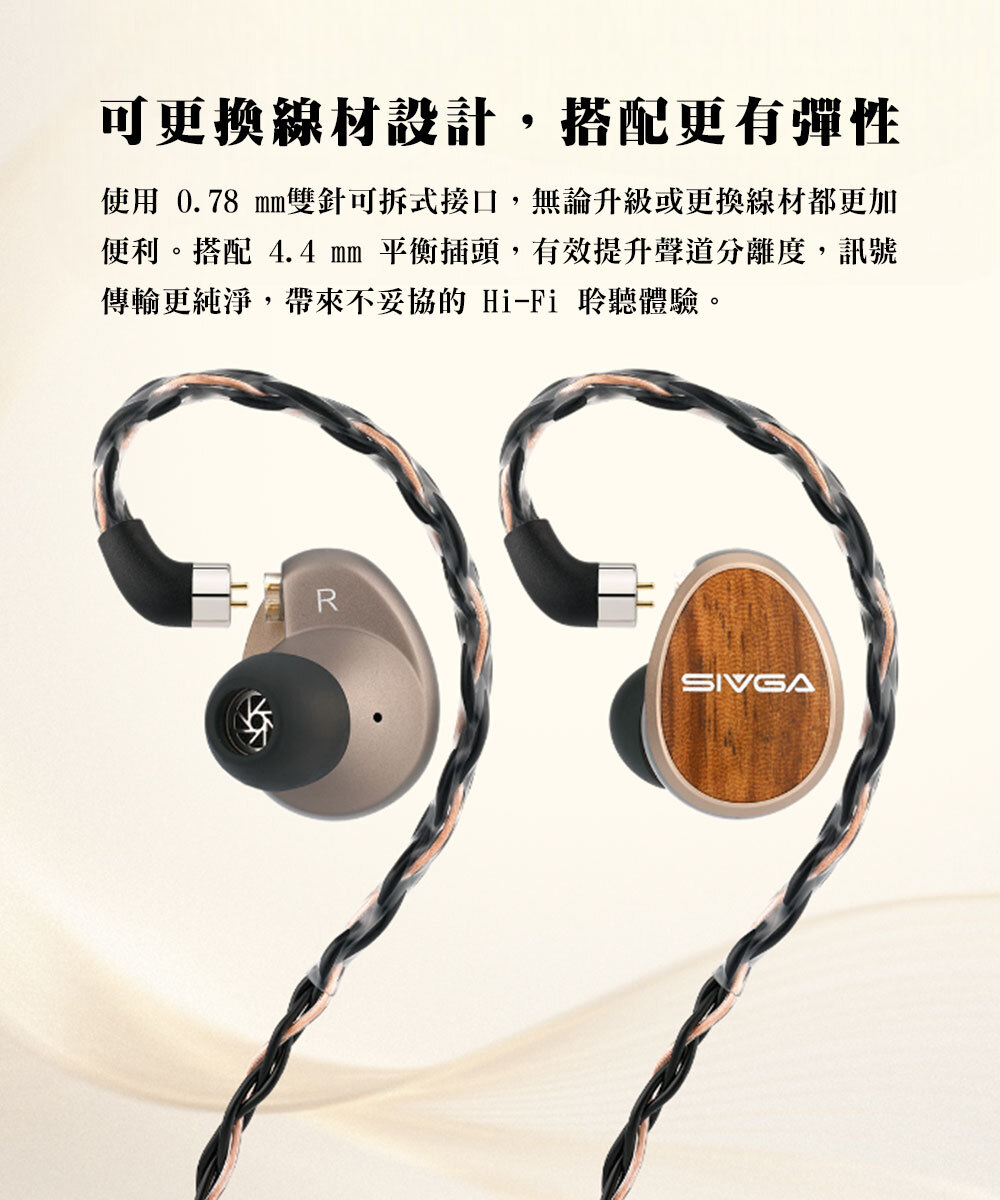 使用 0.78 mm 雙針可拆式接口,無論升級或更換線材都更加便利。