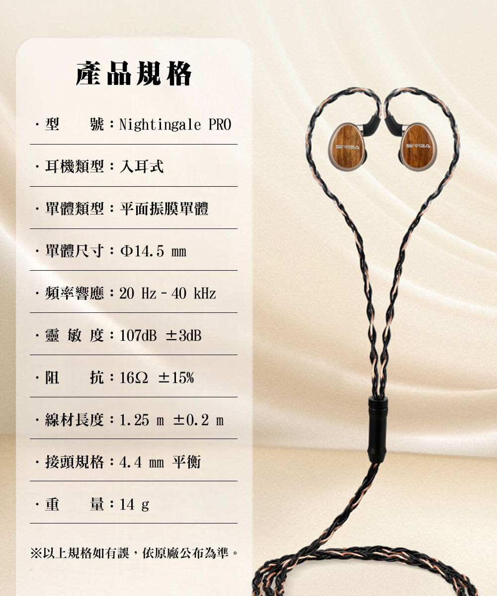 注意事項:本產品僅包含Nightingale PRO耳機*1、耳機收納包*1、S/M/L耳塞*各2對、說明書*1,其他播放器、手機或電腦街為示意圖,不包含在本產品包裝內。
