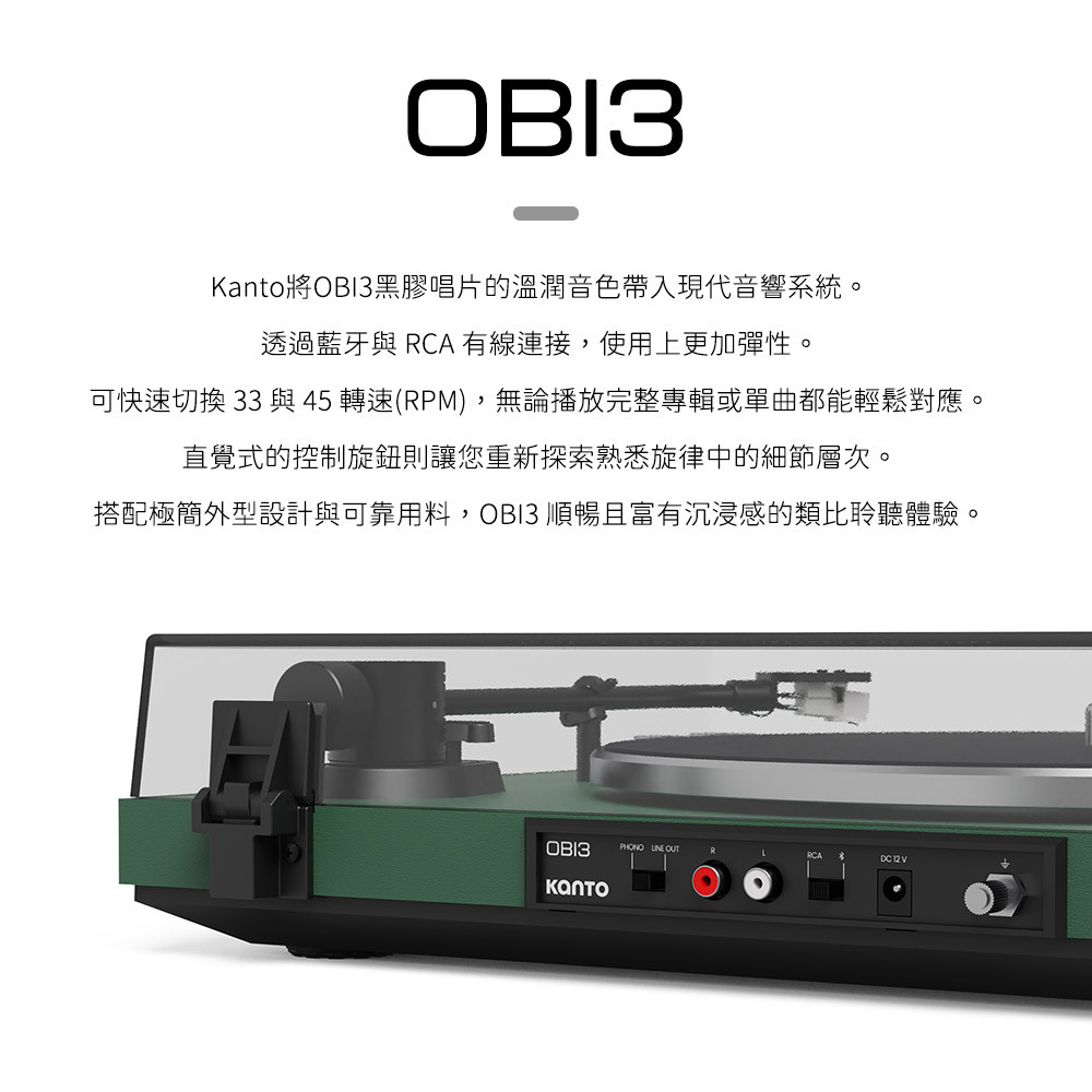 可透過藍牙無線播放,滿足現代便利需求;或使用內建唱放前級的 RCA 連接,體驗經典類比音色;不論搭配主動式喇叭,或接上復古擴大機,OBI3 都能自然融入各種音響系統。