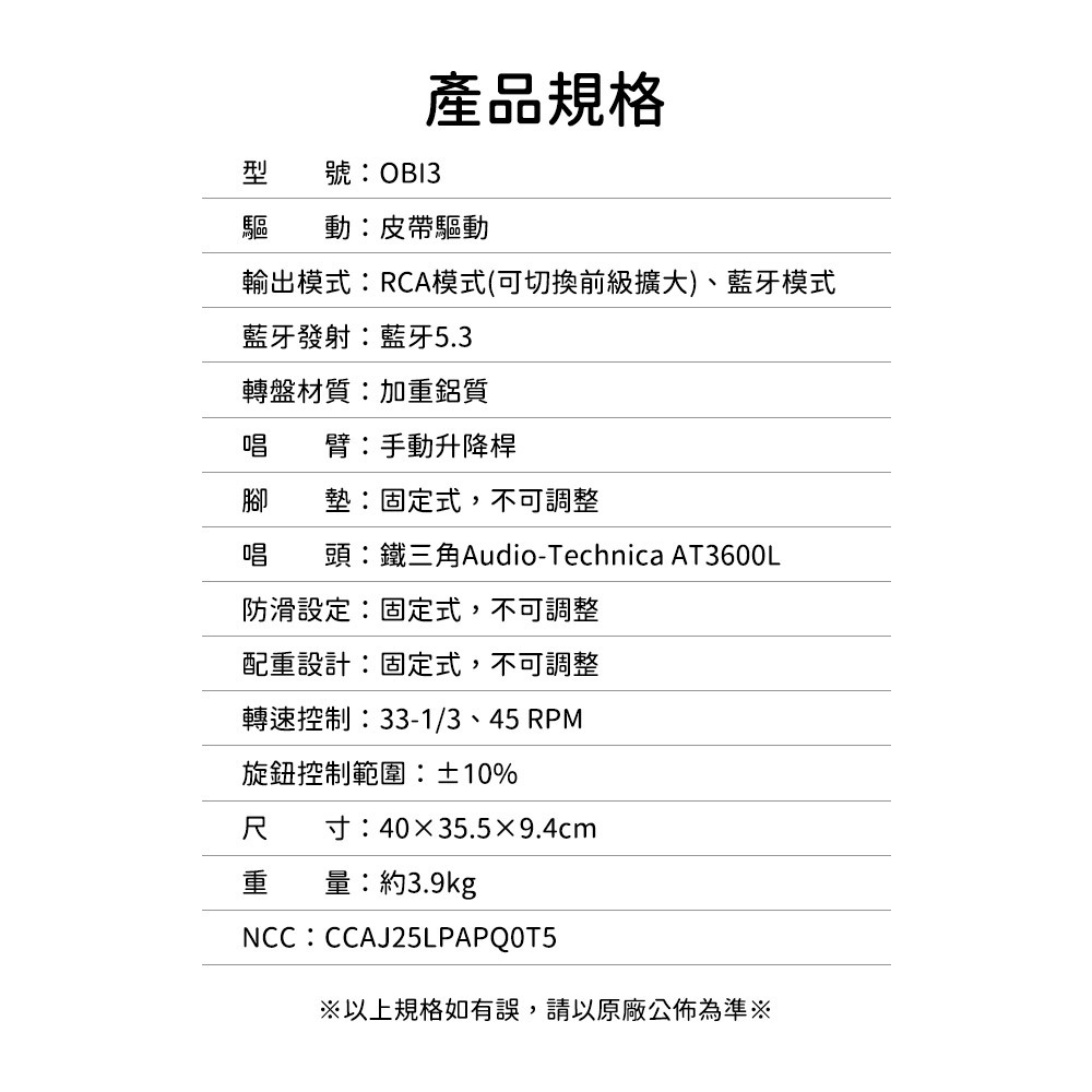 OBI3 原廠預裝經過市場驗證的Audio-Technica AT3600L 鐵三角唱針,以清晰、均衡且循軌穩定著稱;無論是黑膠新手或資深玩家,都能獲得令人滿意的聆聽盛宴。