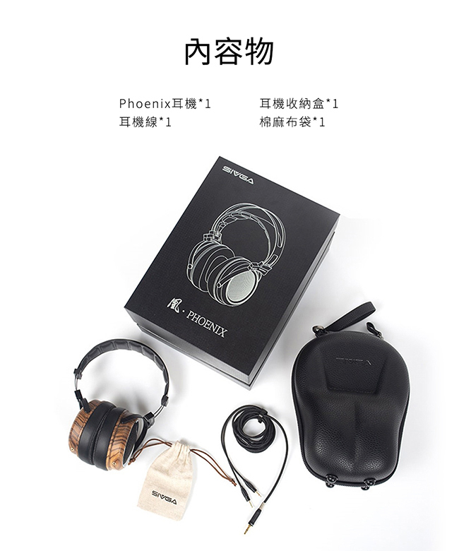 1. 本產品內容物僅包含Phoenix耳機x1、耳機線x1、耳機收納盒x1、棉麻布袋x1。