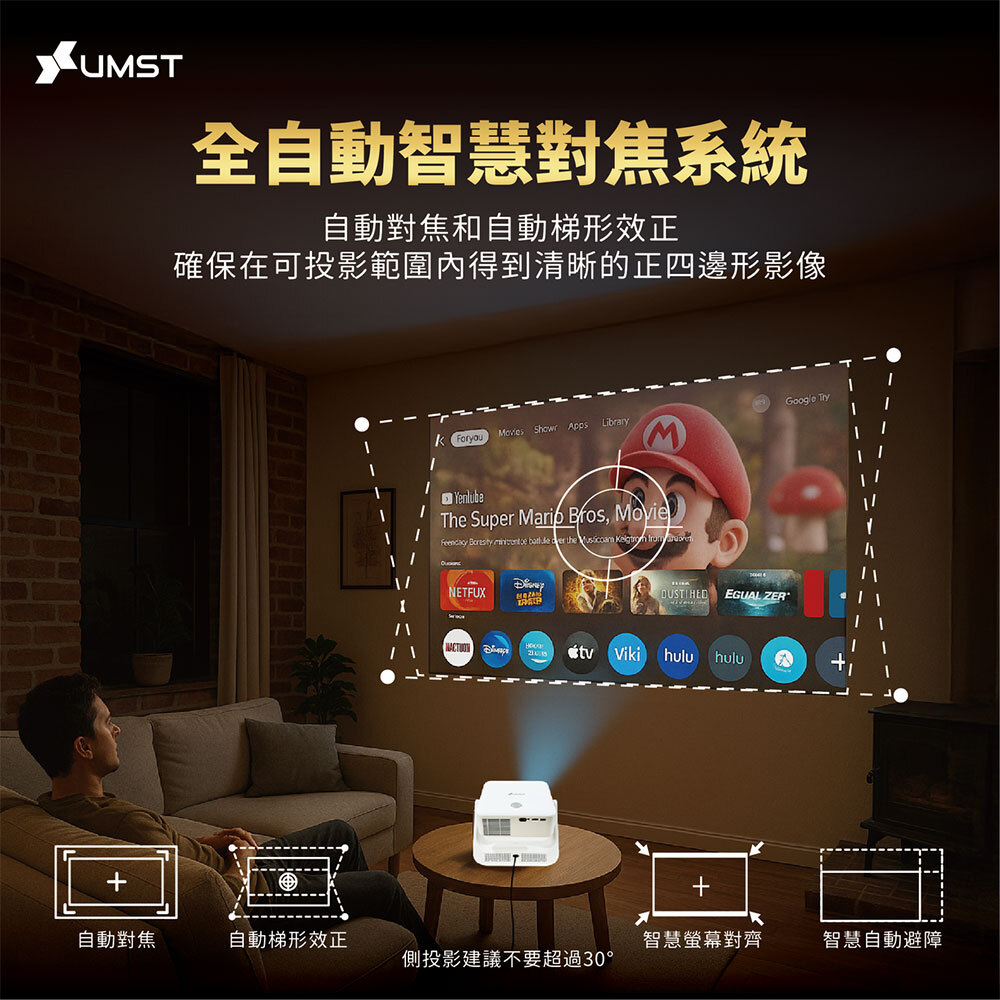 ● 全自動對焦/全向梯形校正+智慧自動避障/入幕