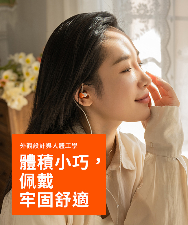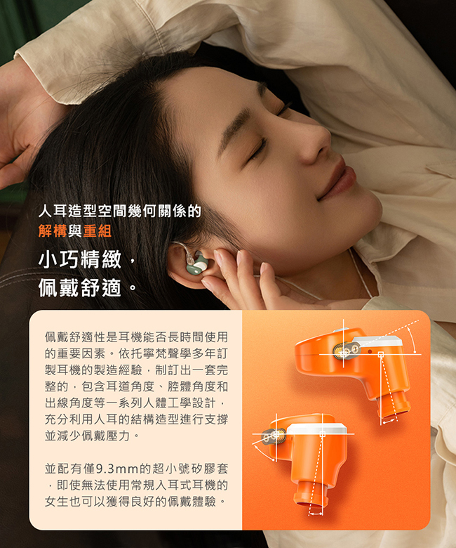 人體工學設計 | 依靠寧梵聲學多年訂製耳機的製造經驗,我們制訂出一套完整的、包含耳道角度、腔體角度和出線角度等一系列人體工程學設計,充分的利用人耳的結構造型進行支撐並減少佩戴壓力。