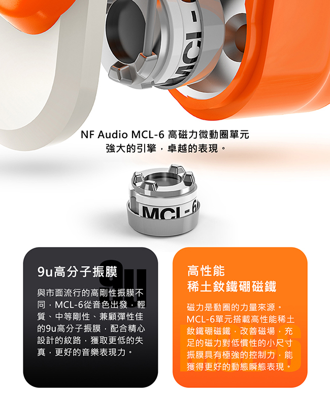 MCL-6 高磁力微動圈單元 | 採用輕質、中等剛性、兼顧彈性佳的9u高分子振膜,配合精心設計的紋路,獲取更低的失真、更好的音樂表現力。並搭載高性能稀土釹鐵硼磁鐵,充足的磁力對低慣性的小尺寸振膜具有極強的控制力,獲得更好的動態瞬態表現。
