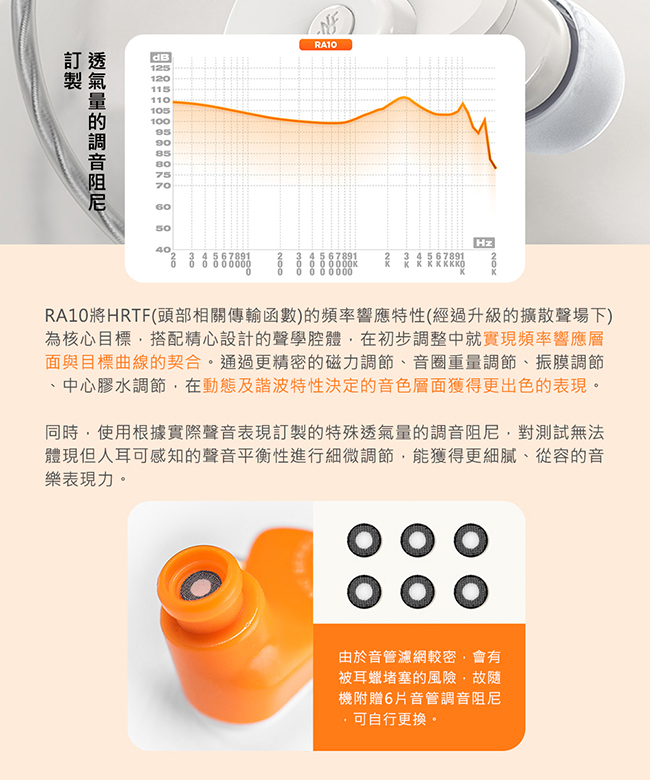 訂製透氣量的調音阻尼 | RA10將HRTF(頭部相關傳輸函數)的頻率響應特性(經過升級的擴散聲場下)為核心目標,搭配精心設計的聲學腔體,在初步調整中就實現頻率響應層面與目標曲線的契合。通過更精密的磁力調節、音圈重量調節、振膜調節、中心膠水調節,在動態及諧波特性決定的音色層面,獲得更加出色的表現。