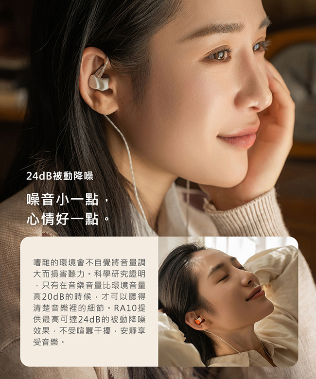 24dB被動降噪 | 提供高達24dB的被動降噪效果,不受喧囂干擾,安靜享受音樂。
