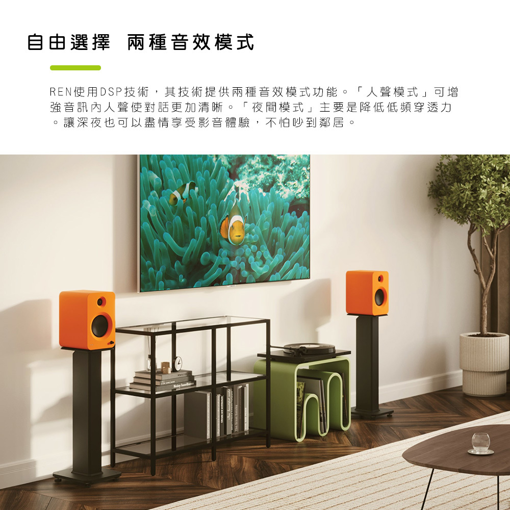 REN使用DSP技術,其技術提供兩種音效模式功能。「人聲模式」可增強音訊內人聲使對話更加清晰。「夜間模式」主要是降低低頻穿透力。讓深夜也可以盡情享受影音體驗,不怕吵到鄰居。
