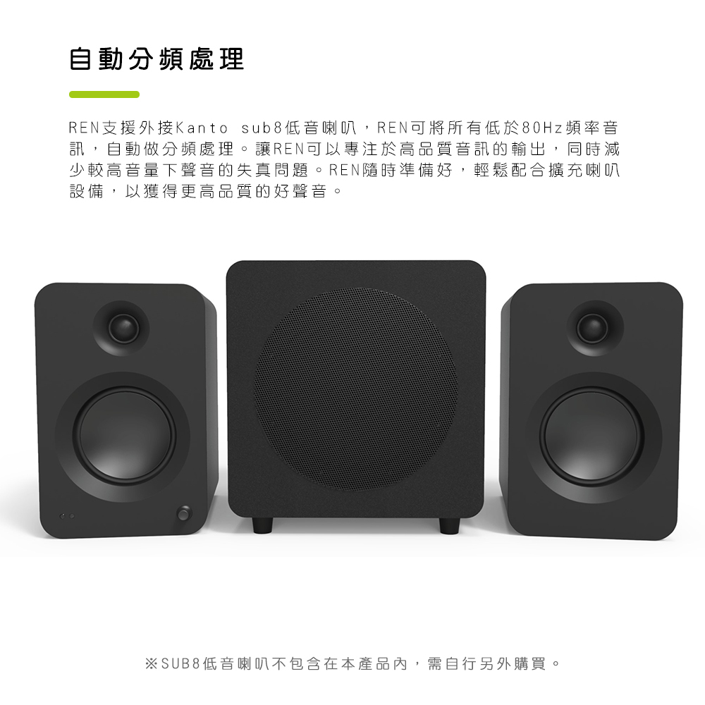 REN支援外接Kanto sub8低音喇叭,REN可將所有低於80Hz頻率音訊,自動做分頻處理。讓REN可以專注於高品質音訊的輸出,同時減少較高音量下聲音的失真問題。REN隨時準備好,輕鬆配合擴充音響設備,以獲得更高品質的好聲音。