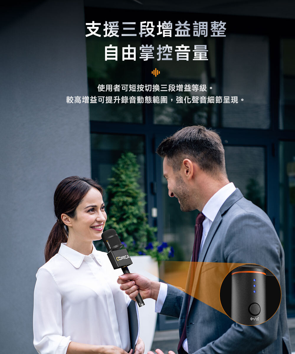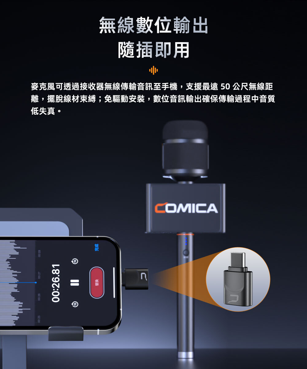 麥克風可透過接收器無線傳輸音訊至手機,支援最遠 50 公尺無線距離,擺脫線材束縛;免驅動安裝,數位音訊輸出確保傳輸過程中音質低失真。