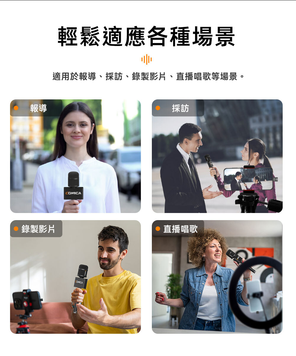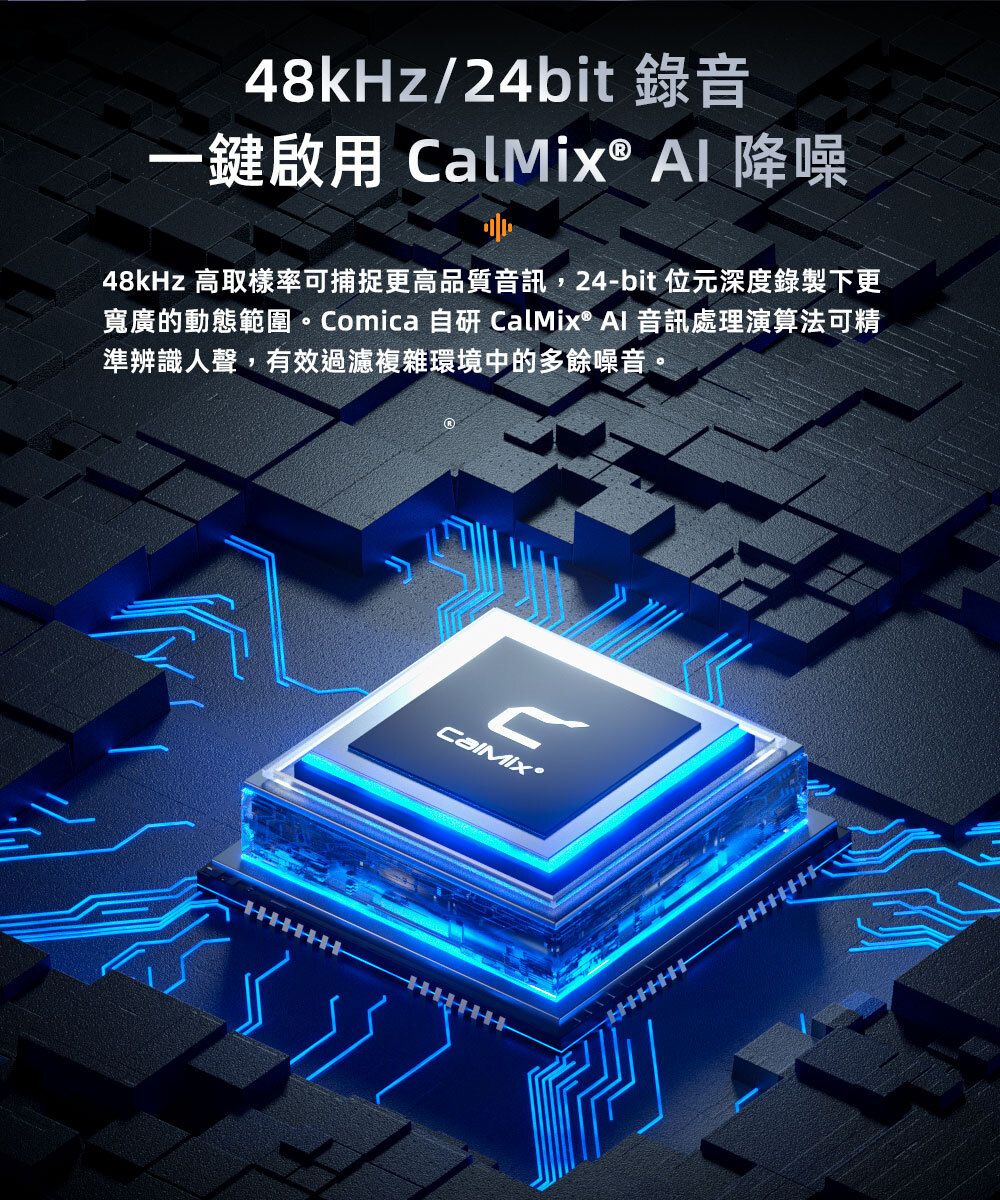 48kHz 高取樣率可捕捉更高品質音訊,24-bit 位元深度錄製下更寬廣的動態範圍。Comica 自研 CalMix® AI 音訊處理演算法可精準辨識人聲,有效過濾複雜環境中的多餘噪音。