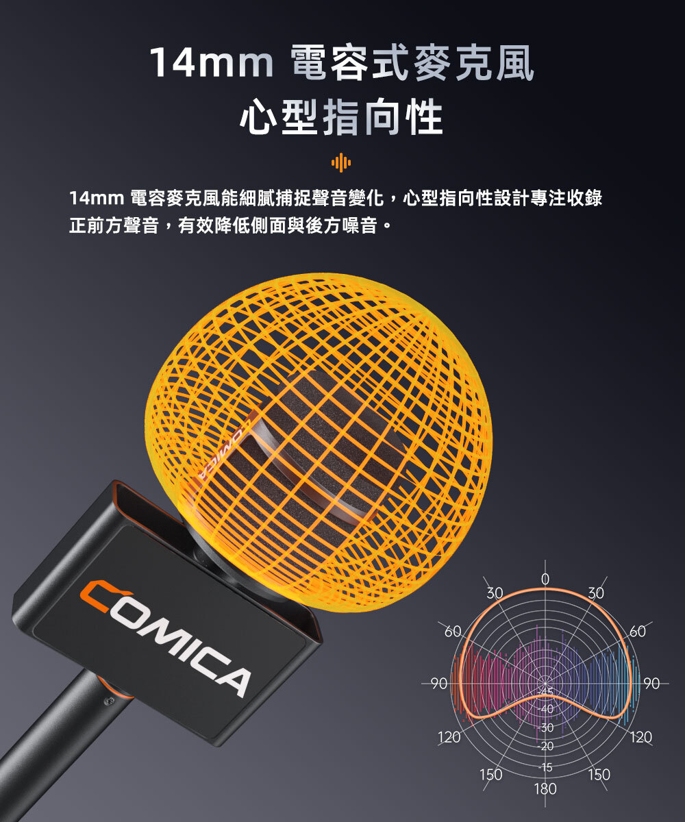 14mm 電容麥克風能細膩捕捉聲音變化,心型指向性設計專注收錄正前方聲音,有效降低側面與後方噪音。