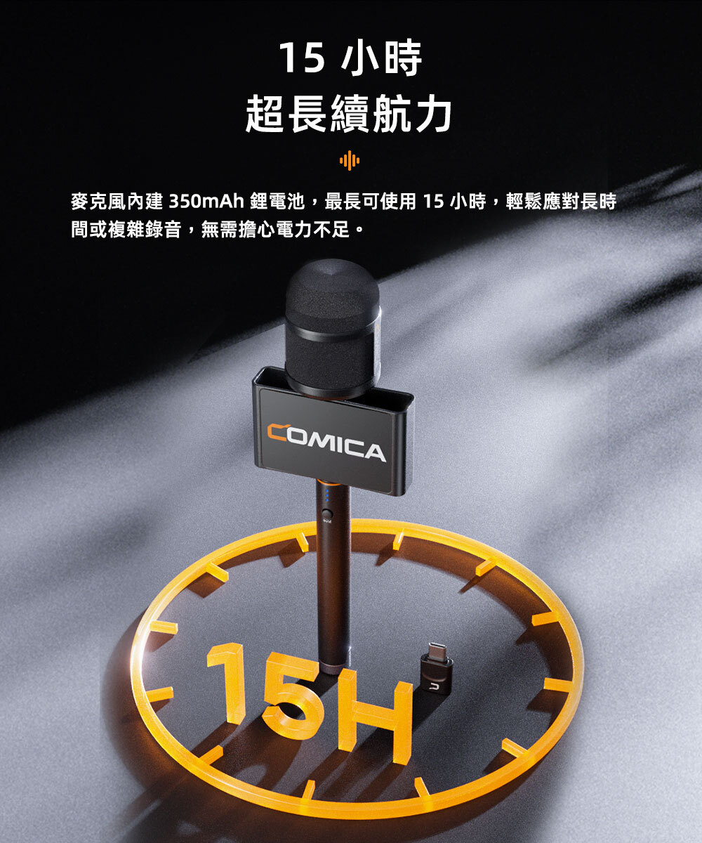 麥克風內建 350mAh 鋰電池,最長可使用 15 小時,輕鬆應對長時間或複雜錄音,無需擔心電力不足。