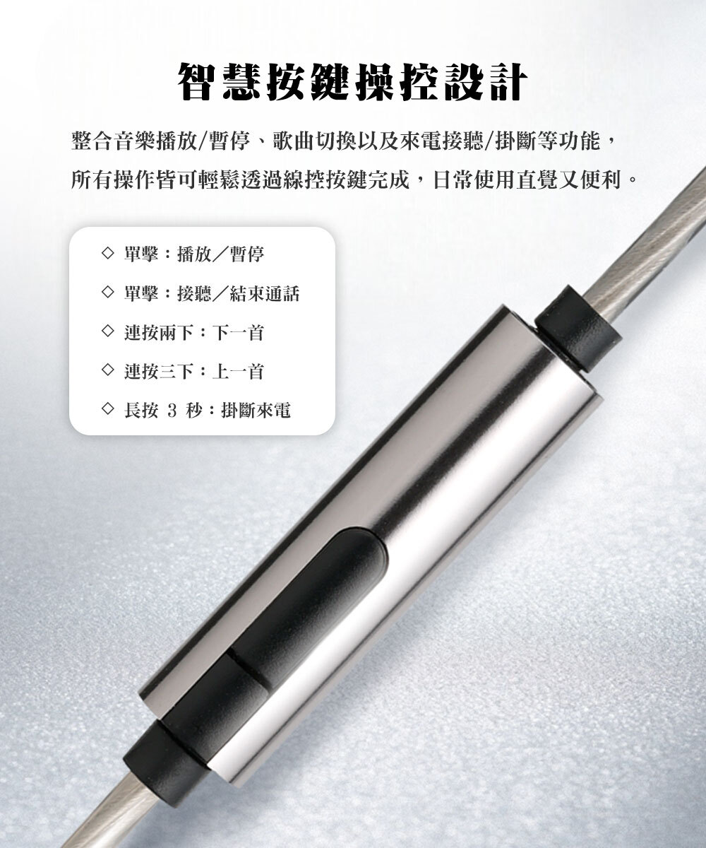 整合音樂播放/暫停、歌曲切換以及來電接聽/掛斷等功能,所有操作皆可輕鬆透過線控按鍵完成,日常使用直覺又便利。
