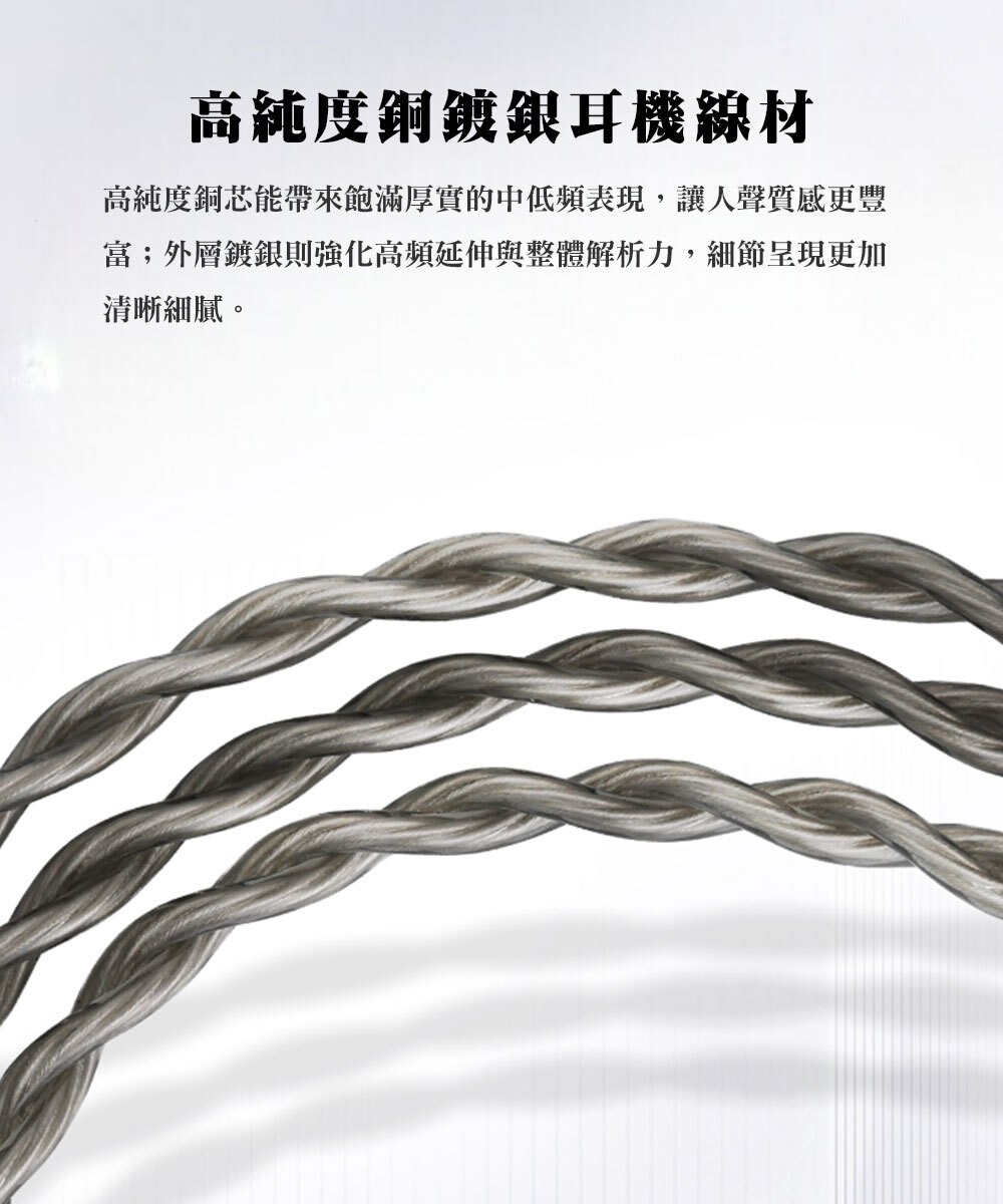 高純度銅芯能帶來飽滿厚實的中低頻表現,讓人聲質感更豐富;外層鍍銀則強化高頻延伸與整體解析力,細節呈現更加清晰細膩。