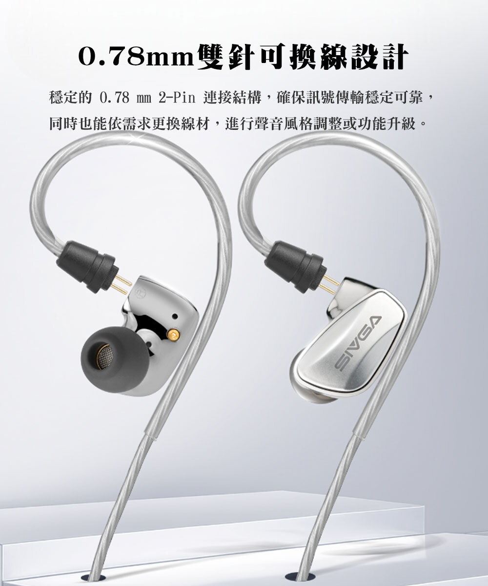 穩定的 0.78 mm 2-Pin 連接結構,確保訊號傳輸穩定可靠,同時也能依需求更換線材,進行聲音風格調整或功能升級。