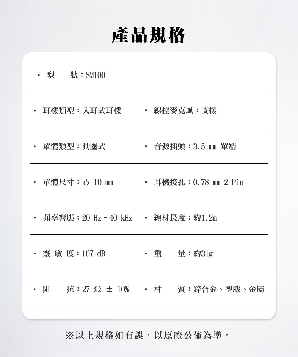 注意事項:本產品僅包含SM100*1、耳塞*2對、說明書*1,其他電腦、播放器...等,皆為示意圖,不包含在本產品包裝內。