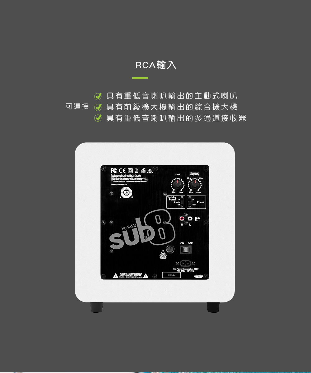 ● RCA輸入可接主動式喇叭/綜合擴大機/多通道接收器