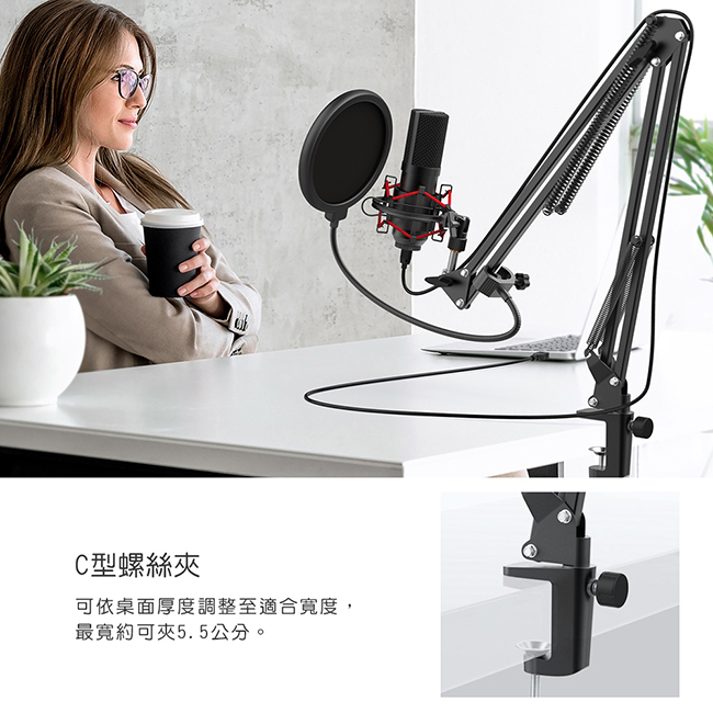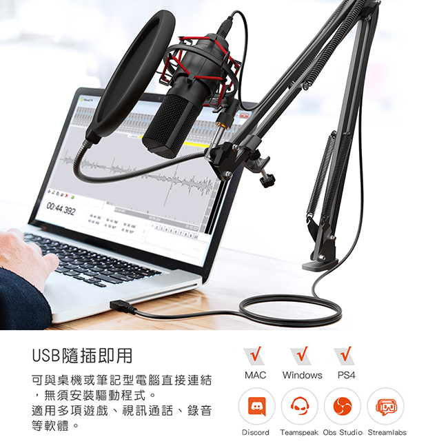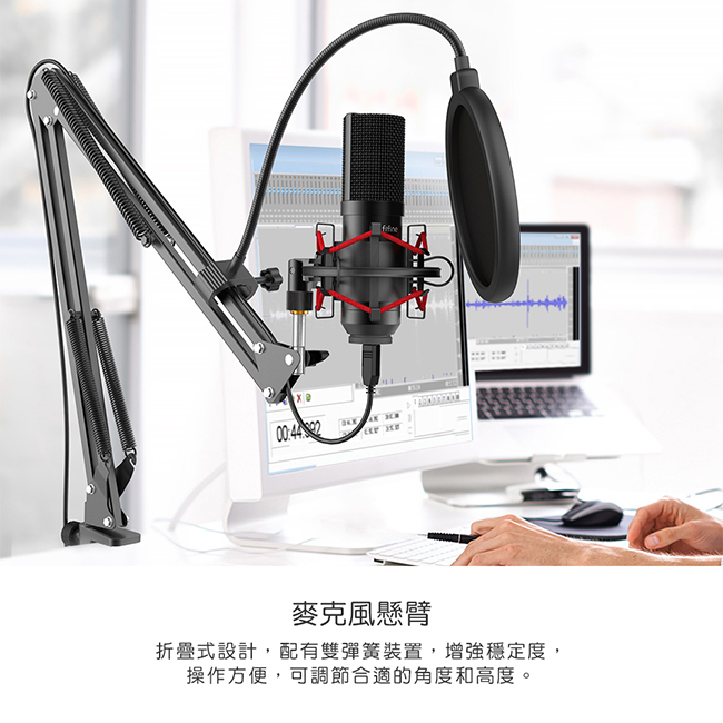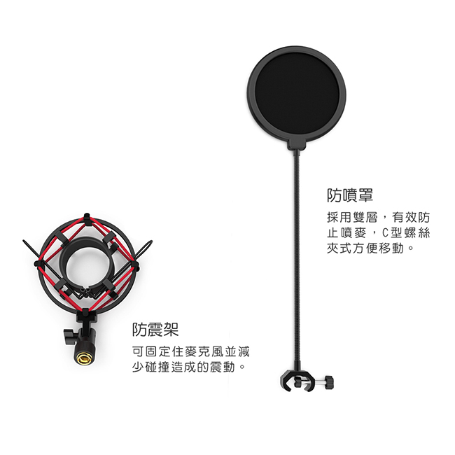 ● 內含麥克風懸臂、防震架、防噴罩,專業設備一次滿足