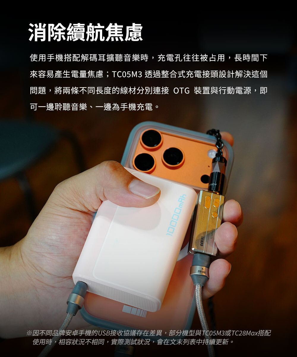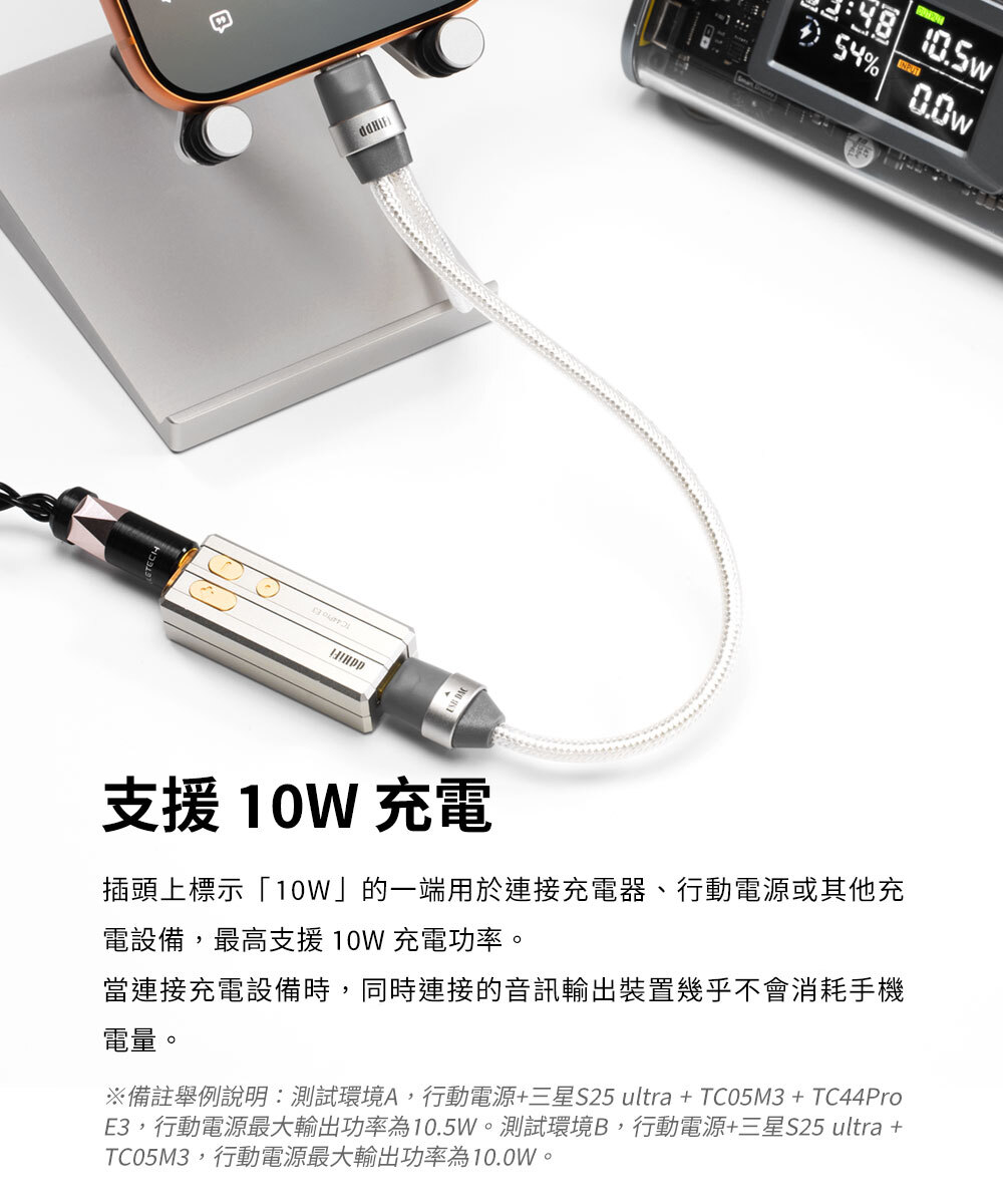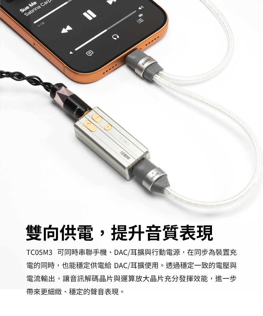 TC05M3 可同時串聯手機、DAC/耳擴與行動電源,在同步為裝置充電的同時,也能穩定供電給 DAC/耳擴使用。透過穩定一致的電壓與電流輸出,讓音訊解碼晶片與運算放大晶片充分發揮效能,進一步帶來更細緻、穩定的聲音表現。