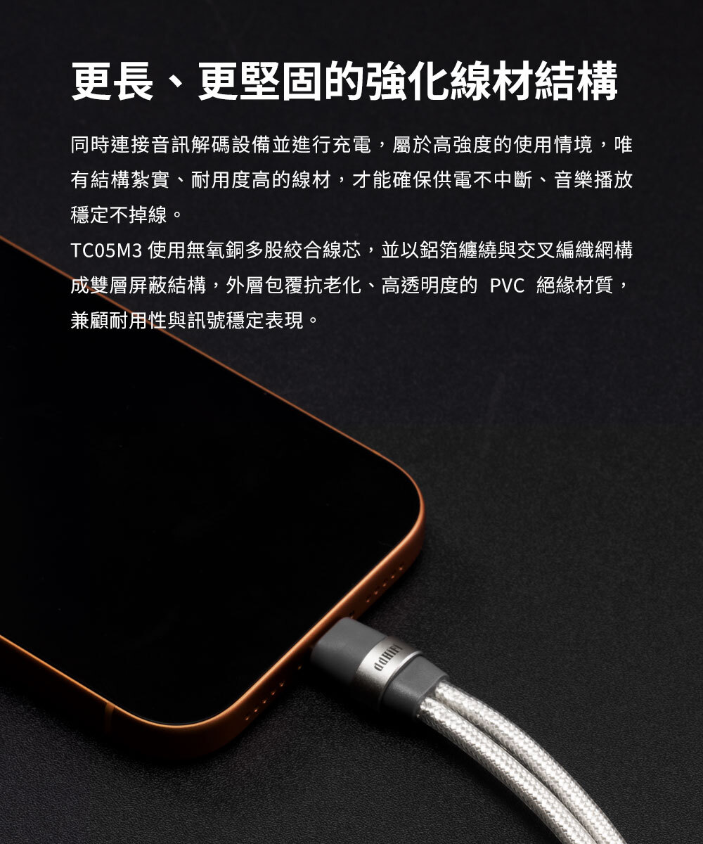 同時連接音訊解碼設備並進行充電,屬於高強度的使用情境,唯有結構紮實、耐用度高的線材,才能確保供電不中斷、音樂播放穩定不掉線。