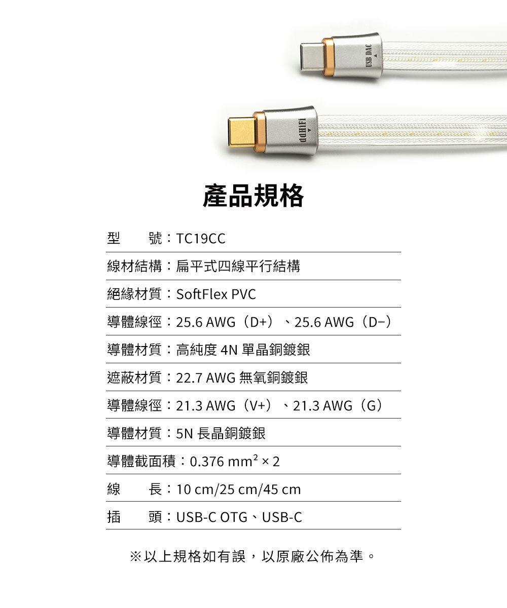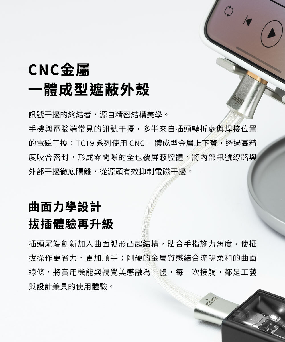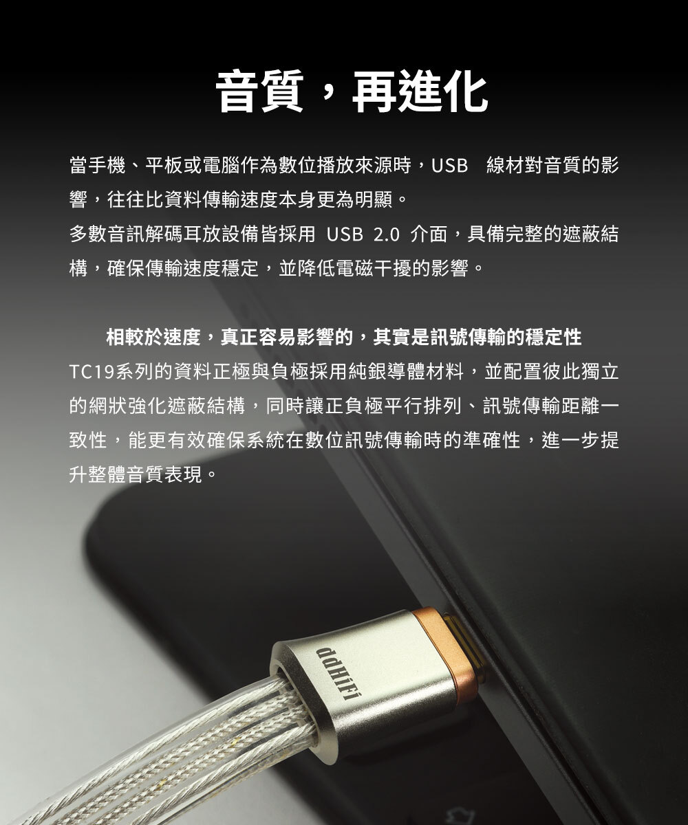 TC19CC 的資料正極與負極採用純銀導體材料,並配置彼此獨立的網狀強化遮蔽結構,同時讓正負極平行排列、訊號傳輸距離一致性,能更有效確保系統在數位訊號傳輸時的準確性,進一步提升整體音質表現。