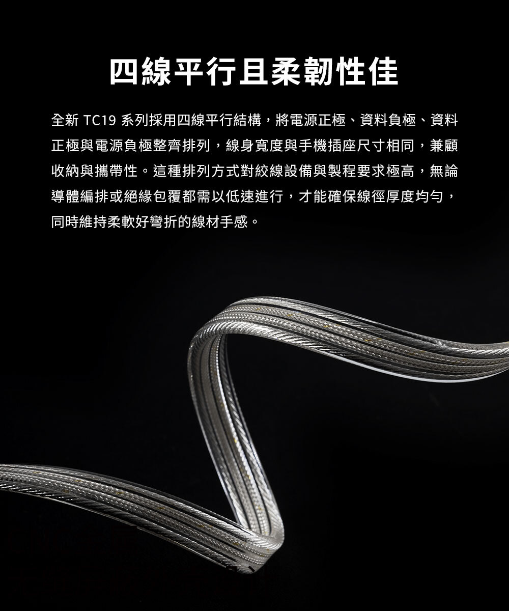 全新 TC19 系列採用四線平行結構,將電源正極、資料負極、資料正極與電源負極整齊排列,線身寬度與手機插座尺寸相同,兼顧收納與攜帶性。