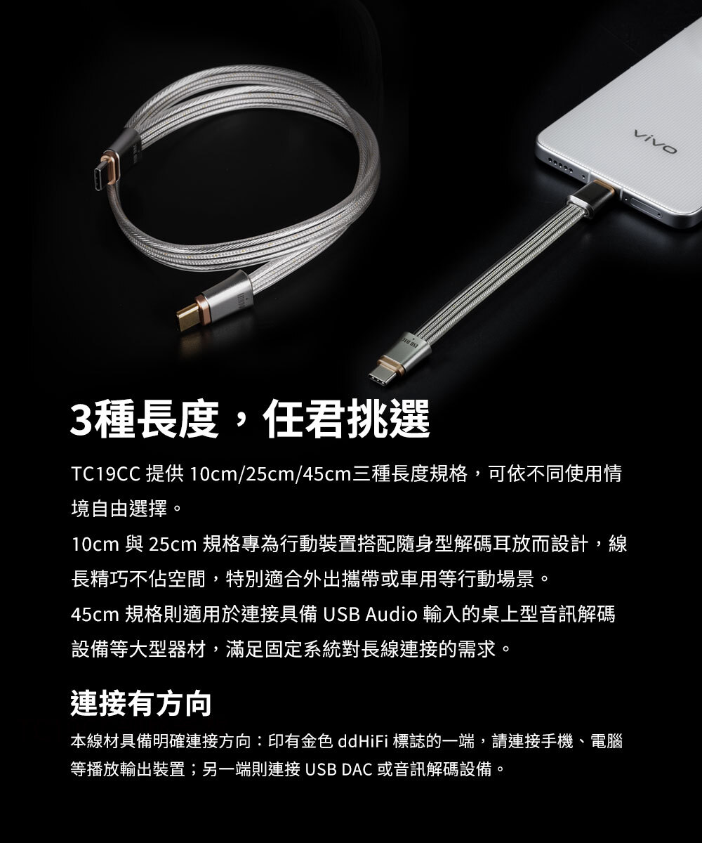 45cm 規格則適用於連接具備 USB Audio 輸入的桌上型音訊解碼設備等大型器材,滿足固定系統對長線連接的需求。